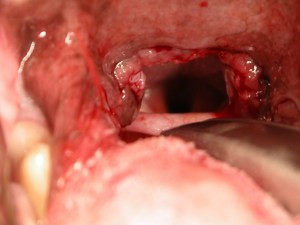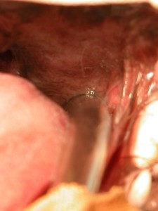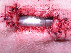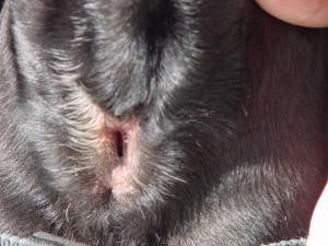 This was confirmed under emergency anaesthesia so I could get Ronald intubated and oxygenated. The decision from there was a choice of partial laryngectomy – partial removal of one side of the rima glottidis to create a permanently “open” larynx. Usually a temporary tracheostomy is required for the first 24-48 hours to recover these patients and they have an ongoing risk of aspiration pneumonia. The other choice was permanent tracheostomy to bypass the larynx. Many brachycephalic animals are poor candidates for this procedure because of body conformation – short thick necks with excessive skin folds and small tracheal diameter. Permanent tracheostomy also requires a dedicated owner willing to go through the initial phase of excessive mucous production, regular maintenance of the tracheal stoma and the life-time management of a dog with an opening directly into the cervical trachea – obviously these guys can’t swim!